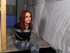 Geknebelte und gefesselte brünette Lesbensklavin Coral Aorta an Holzstangen steht in Position auf einem Bein, wird ausgepeitscht und dann von Lezdom Lorelei Lee in den Arsch gefickt